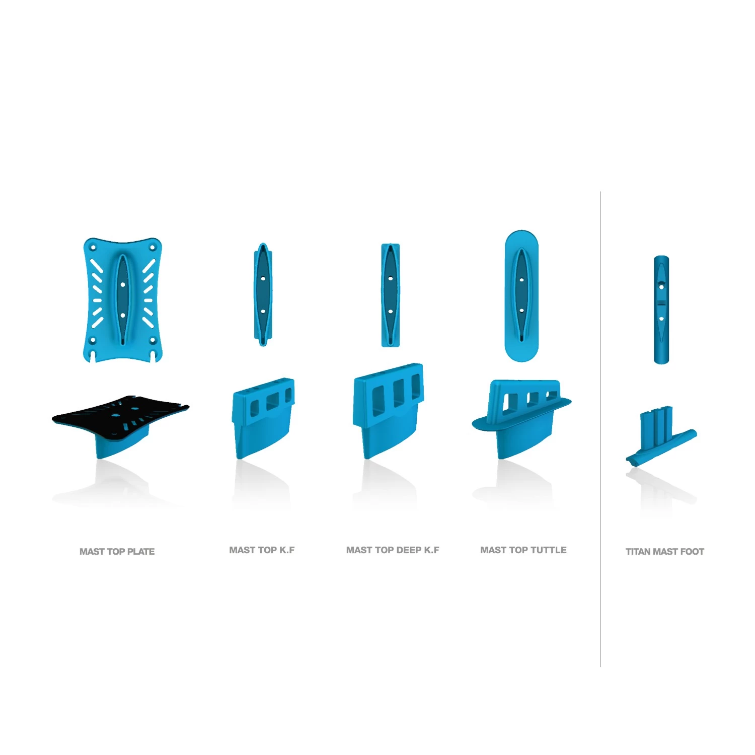 La platine Mast Top Plate permet de connecter les mâts aluminium F-ONE avec toutes les planches ayant un système de twin track (l’espace latéral entre les rails doit être de 90mm). Cette pièce est construite en aluminium 6061, usiné par CNC avec haute précision et entièrement anodisé.
