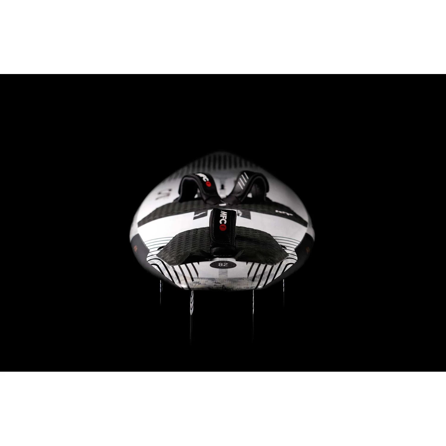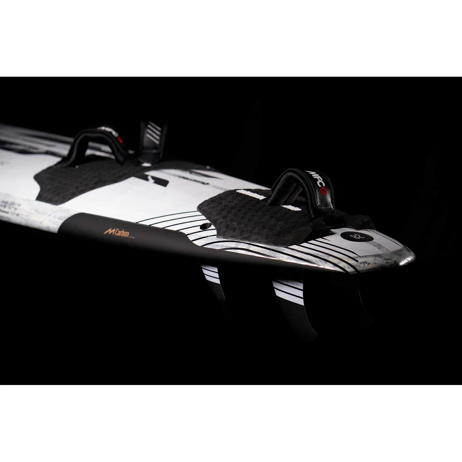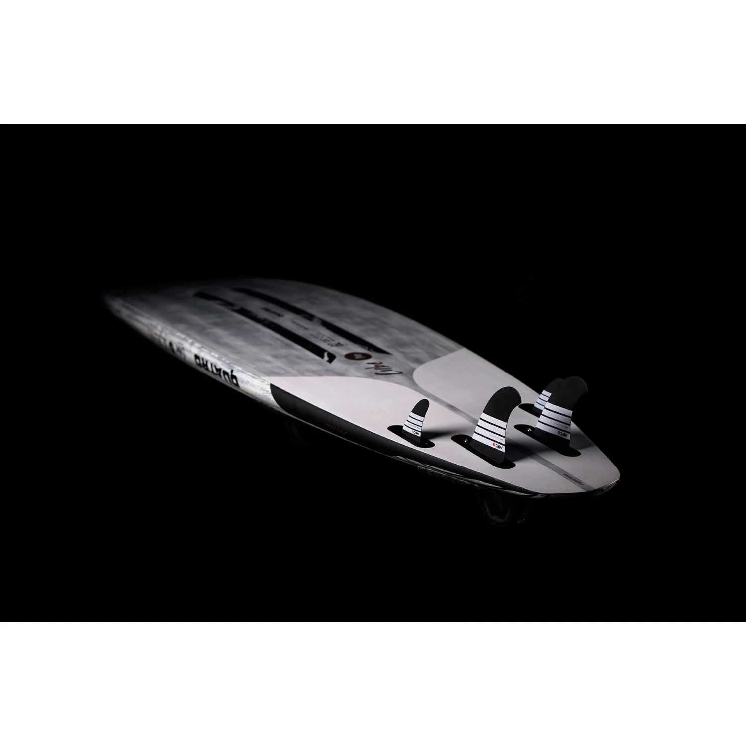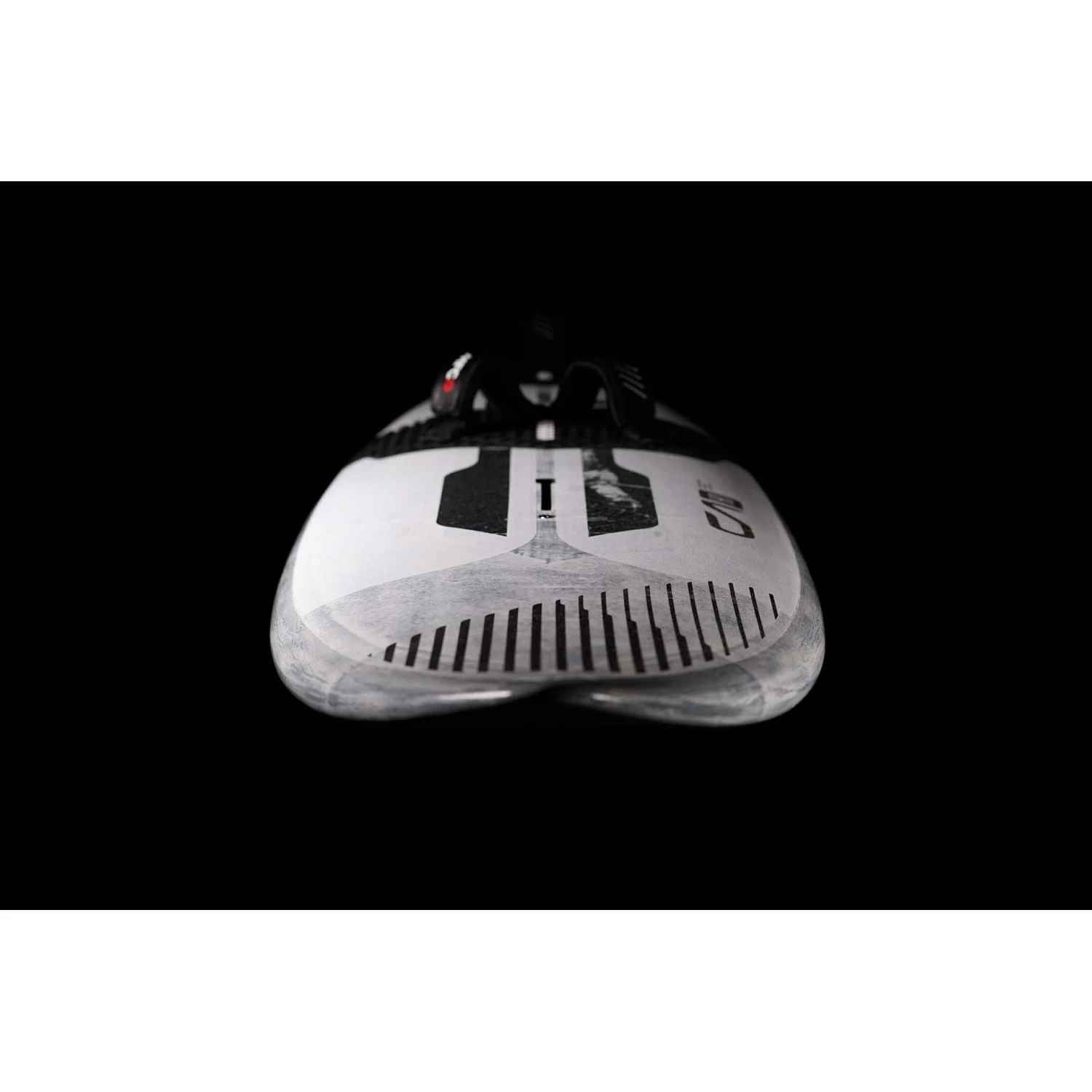 Laminage intérieur du tablier avec laminage en carbone monocoque unidirectionnel UCMMC qui relie la voie du mât à la zone d’appui, BCMMC Biaxial Carbon Monocoque couvrant toute la zone d’appui autour des sangles de pied pour une résistance à l’impact supérieure du talon, bandes de rail en verre S. Plastification extérieure du tablier extérieur en verre BGM? monocoque BIAxial Glass Monocoque couvrant les deux tiers arrière du tablier, tablier en verre S plein.